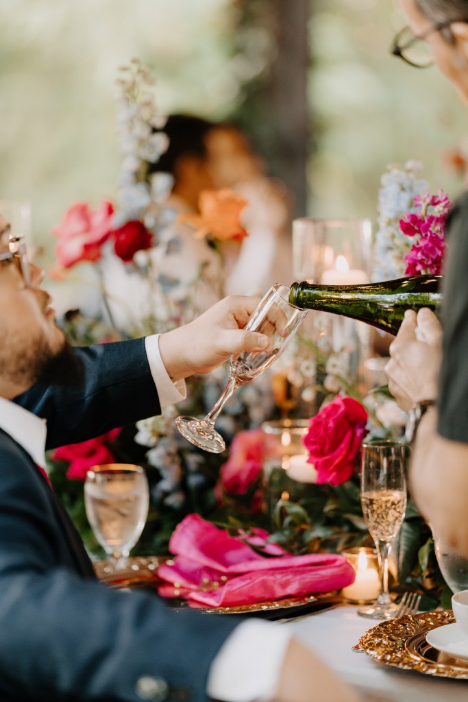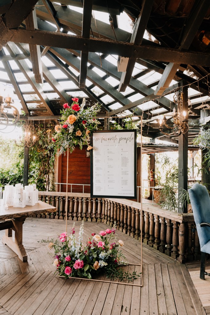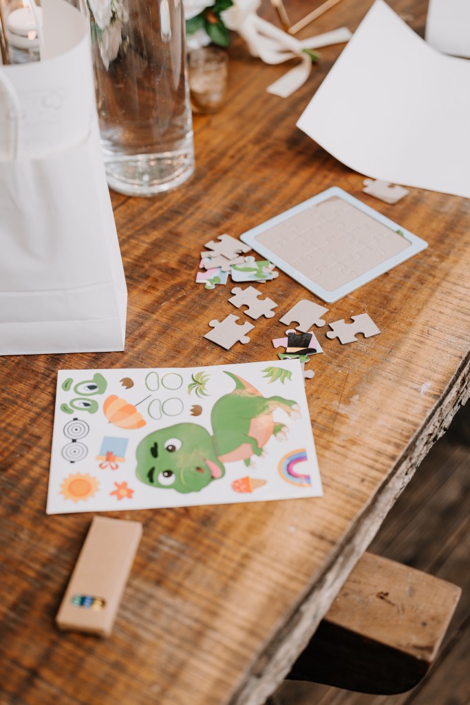 The design was a vibrant blend of elegance and energyβflorals bursting with hot pinks, peaches, and baby blues, gold-rimmed chargers, and bold napkins that added personality to every table. From a modern and floral-adorned seating chart to personalized favors and a playful kidβs table with dinosaur stickers and puzzles, every detail reflected thoughtful care and joy.